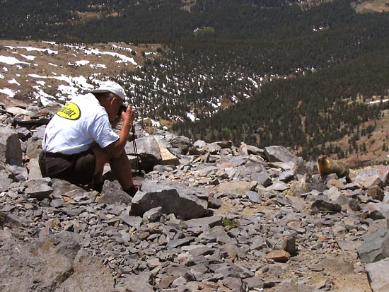 Leave your pack unattended for a minute and this marmot will bite a hole in it! Despite being barren, marmots are often seen on summits and high points of the Sierras.