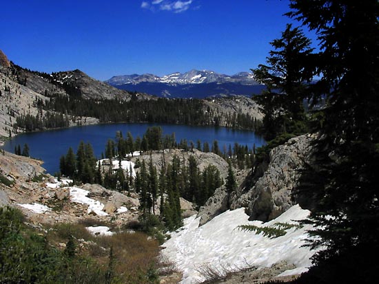 May Lake becomes visible again as more altitude is gained. The ranges in the distant back is the Sierra crest.