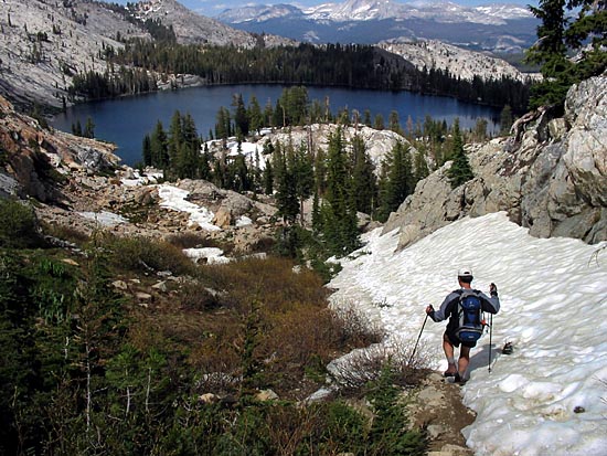 | Loosing the trail can be dangerous... we ended descending the very steep southern face of the mountain. Technology was most helpful for us in this instance... the GPS noted that we were 1.5 km off-course. The cross country detour back to our original trail was steep and difficult. The view of May Lake gave us comfort that we are back on the trail again. | ||||