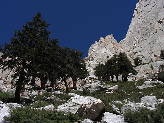 | As the trail ascends, there is a gradual transition from dirt to granite, and the forest cover thins out. Beyond the lip above Mirror Lake, the trail leaves the treeline and it's alpine hiking. | ||||
