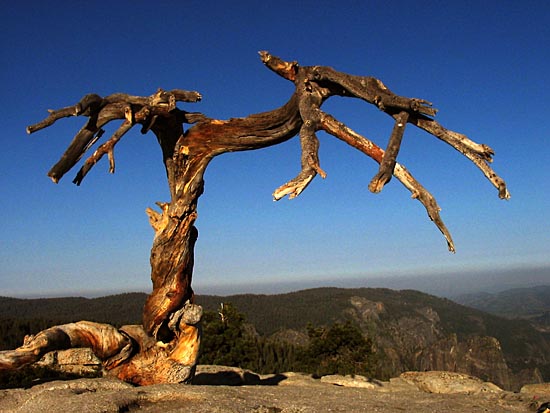 | Jeffrey pines are hardy conifers, typically growing at the higher elevations. It is not uncommon to see mature trees growing out of hard granite slabs as the one on the summit of Sentinel Dome. Made famous by Ansel Adams, the summit Jeffrey pine on Sentinel's summit finally succumbed to vandalism in 1984. | ||||