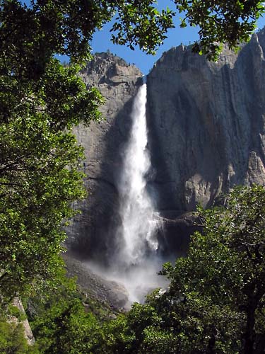 The full splendor of the plummeting Upper Yosemite Fall, an uninterrupted vertical drop of 1,439 feet, is obvious as one climbs the trail.