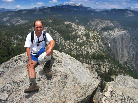 7779 feet! Behind Bobby is a glimpse of the Upper Yosemite Fall, Yosemite Point, and the Sierra crest beyond.