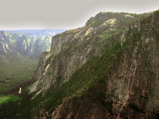 | From Yosemite Point, the view back to the Three Brothers. Eagle "Big Brother" Peak, the Middle Brother, and the Lower Brother... their similarity is the result of parallel fractures that formed in the rock as it solidified millions of years ago. | ||||