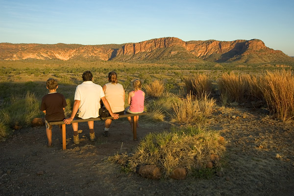 | the majestic cliffs of the western escarpment of the Bungle Bungle Range dominate the landscape and are especially photogenic in the evening when the sun accentuates the red and yellow colours of the sandstone | |||||