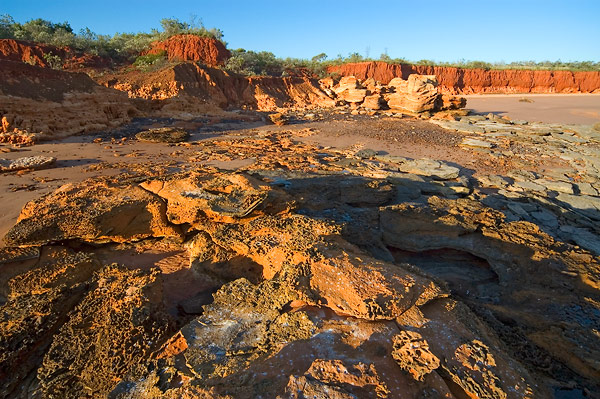 | the oldest exposed rock type around Roebuck Bay is the Broome Sandstone, deposited in shallow water during the Cretaceous period some 120 - 150 million years ago; dinosaurs roamed the region then, leaving behind some footprints that are still preserved today | |||||