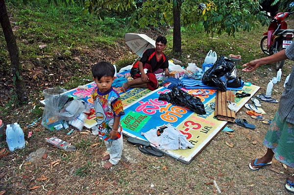 advertisement placard for a floor, umbrella and trees for a roof... this is home for this little boy for at least the next few days