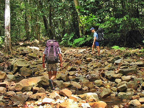 a 1.5 kilometer trek from camp to the base of the waterfall... along the river bed at times