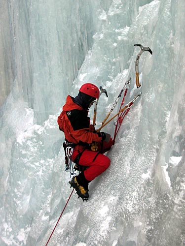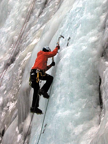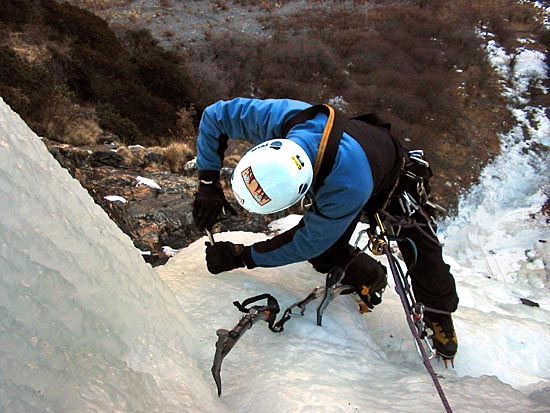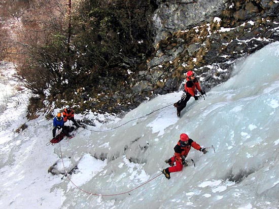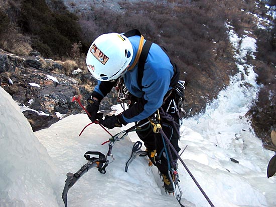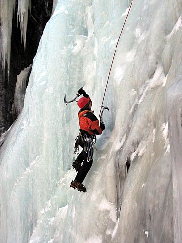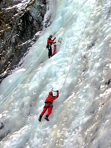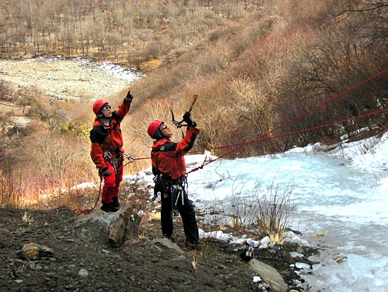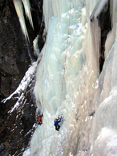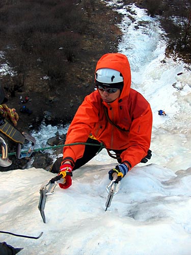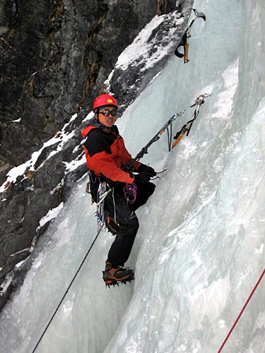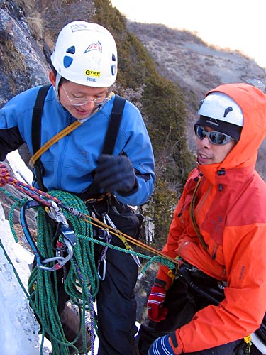 | Ding Ding reaching the base of the ice wall, two routes will be established on this wall today | ||||
