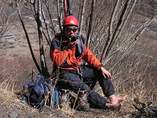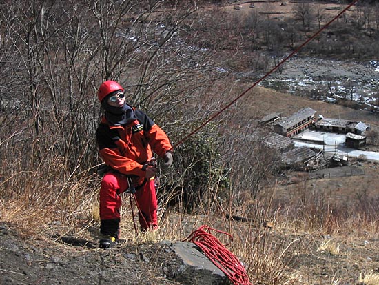 | Ding Ding preparing a V-thread for our abseil down from the crux | ||||