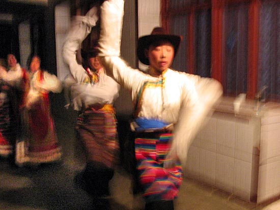 | the evening we were treated to a warm traditional Tibetan cerebration of song, dance, drink and food | ||||