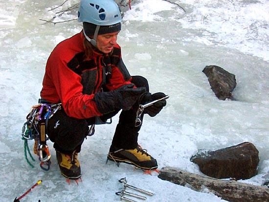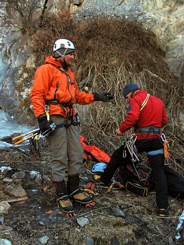 | with ice running thin, Craig hooking onto rock as a better support | ||||