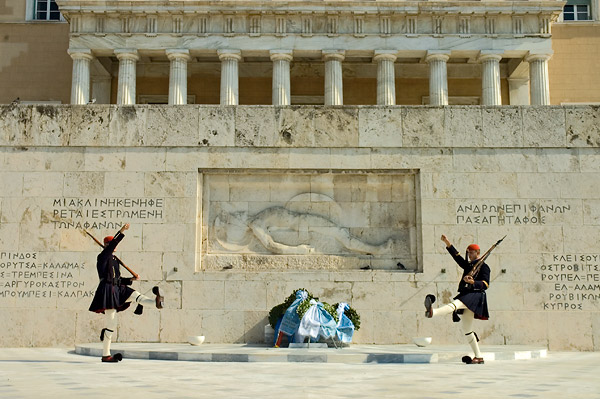 | Evzones on duty perform their movements in a very slow and highly stylized manner and they switch positions with each other every fifteen minutes but otherwise remain completely motionless and at attention in between these position changes | ||||
