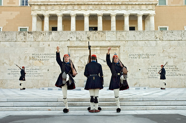 | change of guards take place every hour on the hour, and involve the two incoming and two outgoing Evzone guards, and a supervising "Corporal of the Change"; a Grand Change takes place every Sunday mornings at 11 AM, and involves the whole Guard with its officers and a military band, all marching from the Guard Barracks to the Tomb for the Change, and back | ||||