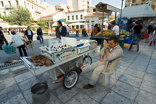 | Monastiraki, which means 'small monastery' is an old part of Athens which nestles under the ancient Acropolis; Monastiraki Square is the hub of life around here and the main street leading off takes one to numerous narrow streets with a thousand artifacts to buy and sell | ||||